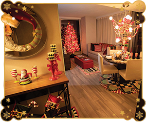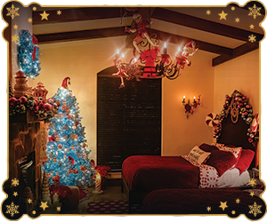 This immersive holiday suite features two glistening Christmas trees, festive tabletop décor, themed furniture, and seasonal velvet bedding and pillows—curated to feel like Santa’s home away from the North.